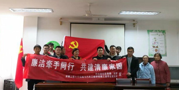 新芜路社区党委副书记卞飞扬首先介绍了社区党支部构成、人员构成等情况,并就社区的“三会一课”制度进行了经验分享。随后开展了题为“廉洁牵手同行 共建清廉家园”支部共建活动, 学习了新修订的《中国共产党纪律处分条例》,双方就“廉洁、区域共建、居校联合”等方面进行交流,并共同在横幅上签名承诺,全体党员表示要严守党规党纪,强化廉洁自律意识。