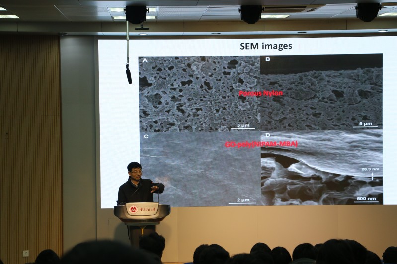 报告会上,王教授首先给广大师生介绍了膜分离的基本原理、现状及应用前景。然后围绕“金属骨架基膜在离子和手性分离中的应用”这一主题,介绍了其课题组近年来在MOF及石墨烯基膜的设计制备以及在金属离子和手性分离方面的应用,并深入研究了影响各种气相和液相分离膜及渗透膜的分离效率的因素,阐述了其分离机制,展望了膜分离领域未来的重点研究方向。报告尾声,王教授与师生就相关膜分离的学术问题及员工的国际交流问题进行了深入的交流和探讨。会后,王焕庭教授就刘琪教授主持的国际合作项目工作给予了充分指导,并指出了后续研究的重点方向。