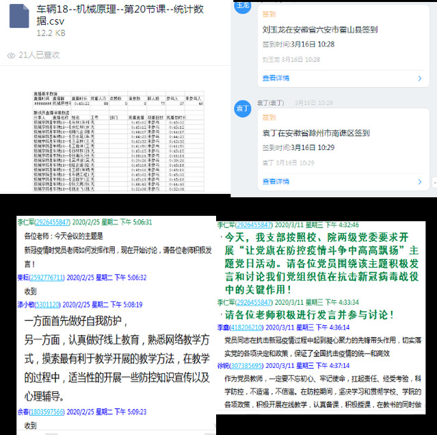 在线教学方面 在线教学对于大多数老师是新鲜事物,大规模的在线授课对教师和各网络平台都是严峻的考验。为了保证顺利开课,我部教师提前启动,积极主动参加公司组织的网络教学培训,积极摸索网络教学方法。老师们对钉钉直播、QQ群课堂、学习通、雨课堂、慕微课堂、腾讯课堂等线上教学平台认真学习和积极试用,并在群里分享经验和使用心得。老师们经过不断尝试,确定最适宜的在线教学平台。基础部要求各位老师提前建群,主动联系员工,并至少提前一天在线试讲一次,确保能顺利进行在线教学。针对部分网络平台出现的拥堵问题,及时调整授课方式,确保按照课表完成教学任务。另外,线上教学过程中实施严格管理,要求同学按时在线签到,认真听课,积极参与课堂互动,并按时提交作业,基本达到预期的效果。