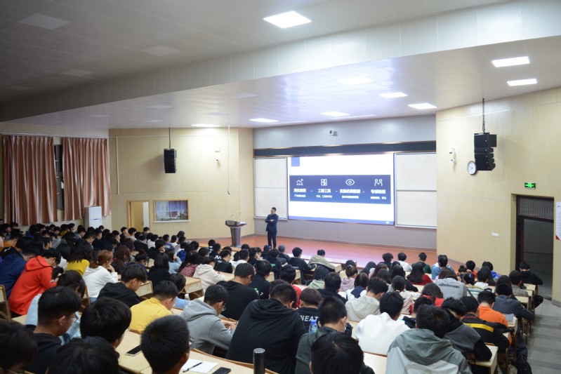 报告伊始,江本赤代表公司对徐跃飞的到来表示热烈的欢迎,向同学们介绍了他在创业过程中,尤其是在AI领域所取得的成绩。徐跃飞以“转型发展之路—从钢铁行业到人工智能教育与行业应用服务领域”为主题展开报告。他首先表达了重返母校的激动之情,感谢母校的教育和培养。在报告中他分享了自己的求学路程和工作经历,曾经高考失利带来的失落和挫败感并没有让他停下脚步,而是通过加倍的努力,弥补不足、充实自己,本科毕业后以优异的成绩考入东南大学攻读硕士学位。由设计工程师到现场项目经理,由钢铁行业销售经理再到广州市高技能人才公共实训基地项目经理的工作经历,使他感受到选择行业的重要性,各行各业发展变化势头之迅猛,不由得发出感叹:势,不可违!他提醒同学们一定要找准行业和定位,做好职业规划。