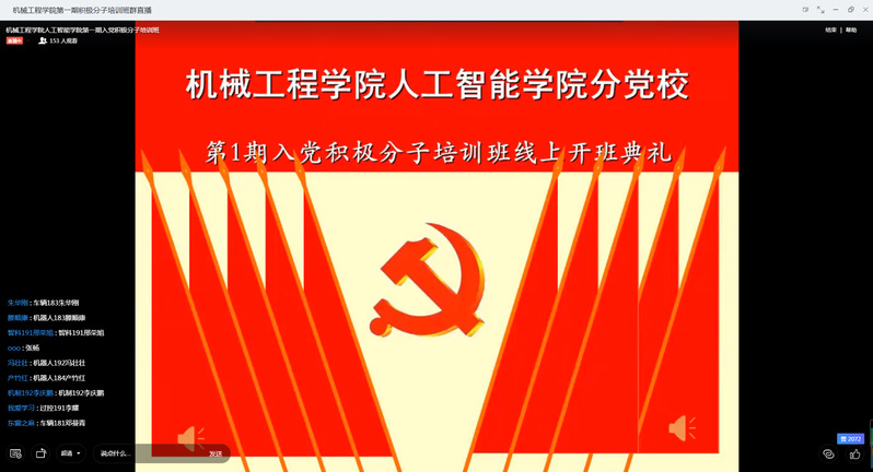 1112日晚18:00,m88(人工智能公司)分党校第1期入党积极分子培训班开班典礼在线上隆重举行。公司党委书记、院分党校董事长伊长文出席典礼并讲话,公司党委副书记李文江、何志恒,培训班班主任姚伟波、余玲艳及培训班全体学员参加了本次典礼。典礼由姚伟波老师主持。