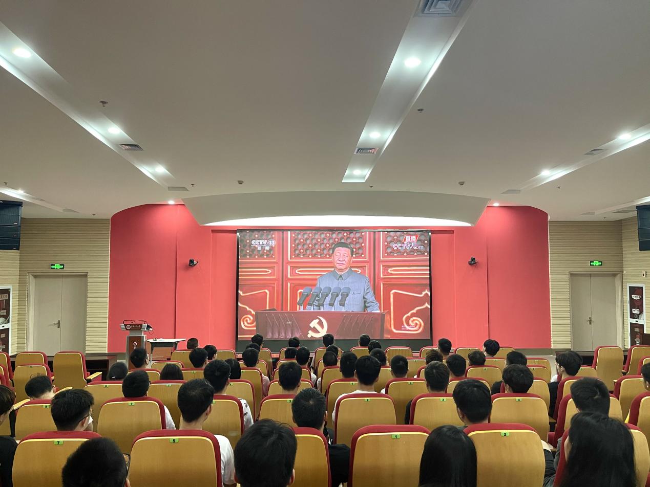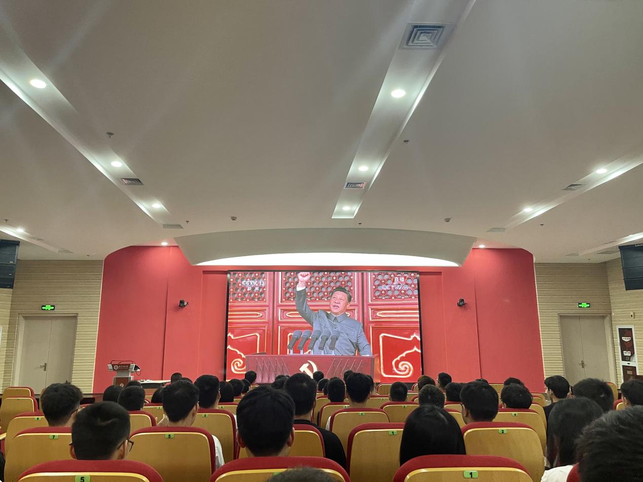 大会在庄严的国歌中拉开序幕,全体参会人员起立奏唱国歌。大会上,中共中央总书记、国家主席、中央军委主席习近平同志发表重要讲话,习近平总书记带领我们回顾了中国共产党百年奋斗的光辉历程,提出了实现中华民族伟大复兴的时代新要求。全体师生深受感召,情之所至,会场不自觉响起阵阵鼓掌欢呼声。一百年砥砺奋进,一百年沧海桑田,翻阅厚重的历史书卷,百年来山河无恙,国富民强,中国共产党在波澜壮阔的历史进程中不断发展壮大。