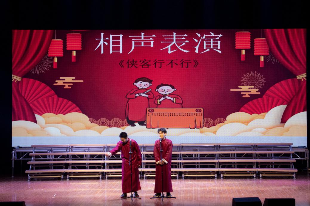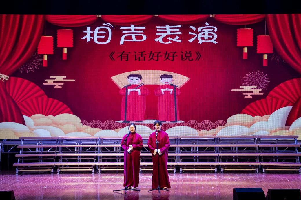 古典扇子舞《万疆》中翩婉的舞姿演绎了中华的风华正茂,展现出华夏的生生不息;相声《侠客行不行》雅俗共赏,趣味横生,在谈笑中领悟不一样的人生道理;小品《英雄》用幽默诙谐的方式诉说着同学们对英雄的理解;花式篮球《灌篮高手》朝气蓬勃,充满激情,引得现场尖叫连连;中华汉字的传统源远流长,相声《有话好好说》带领在场师生领略了语言的魅力;员工歌曲联唱《燕归巢》《塑料袋》《残酷月光》,阵阵歌声或悠扬轻柔或激情豪迈,引得在场师生忘我跟唱。