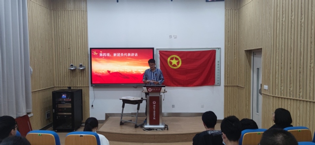 接着,全体新团员面向团旗端正肃立,举起紧握的右拳,在团员代表刘若辰同学的领誓下,完成了庄严的入团宣誓。铿锵有力的宣誓声在教室中回荡,庄重的誓词让新团员更加明确了自己肩上的责任与使命。机制201团支部的郑乐飞同学作为新团员代表上台发言,在他的讲话中提出了对未来团员历程的期望,对新团员自身提出了需改善的方面。苑雨露对各位新团员的加入表示了热烈的祝贺,并提出了殷切期望。在疫情形式仍较严峻之时,每位团员更应严格监督自己,遵守公司的规定,做好带头作用,努力将自己培养成为⼀名合格的团员。