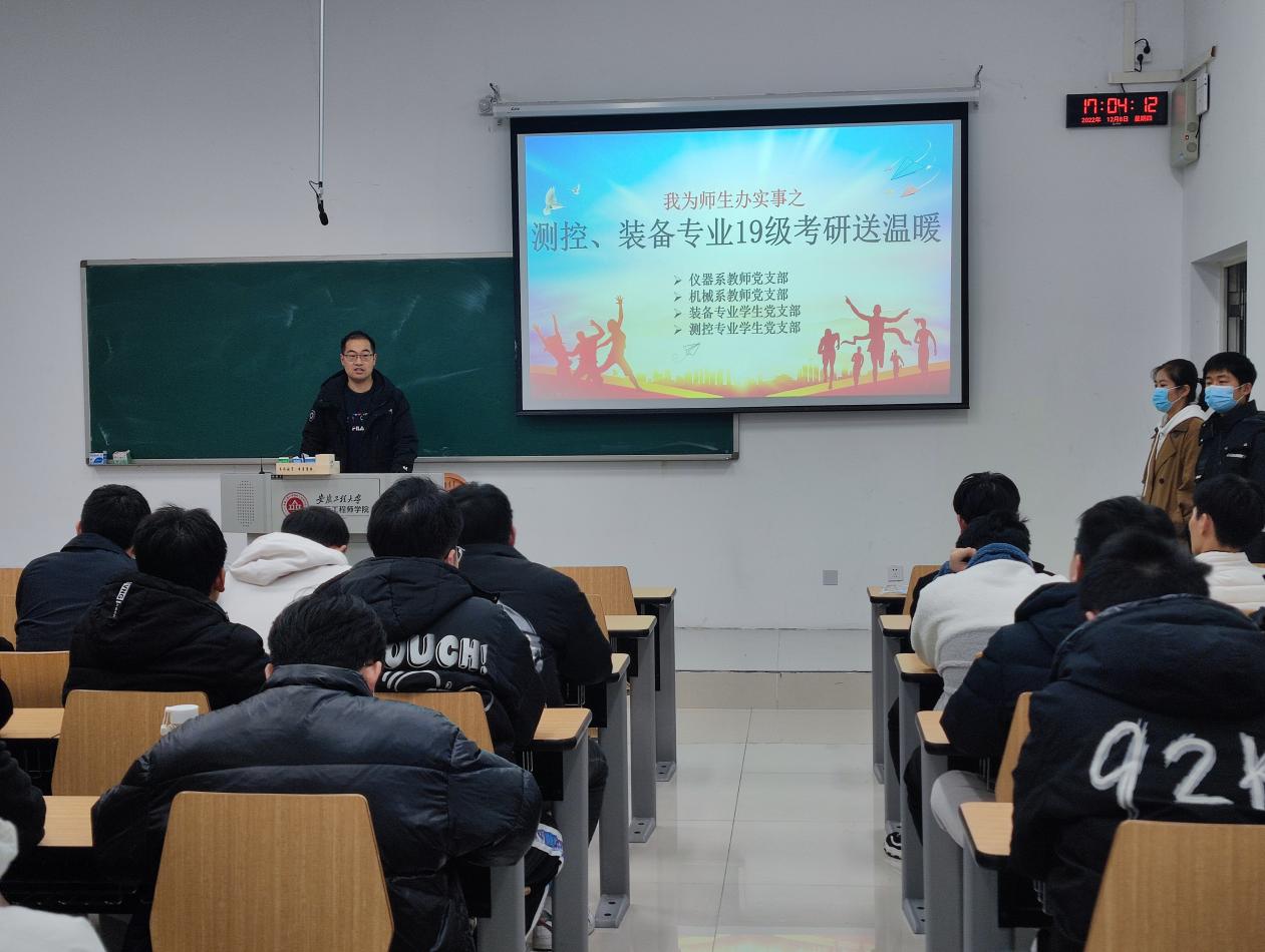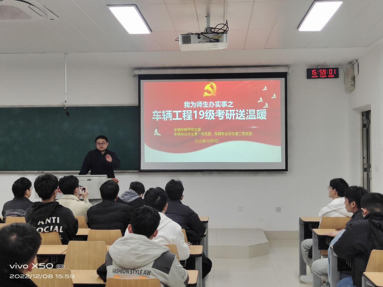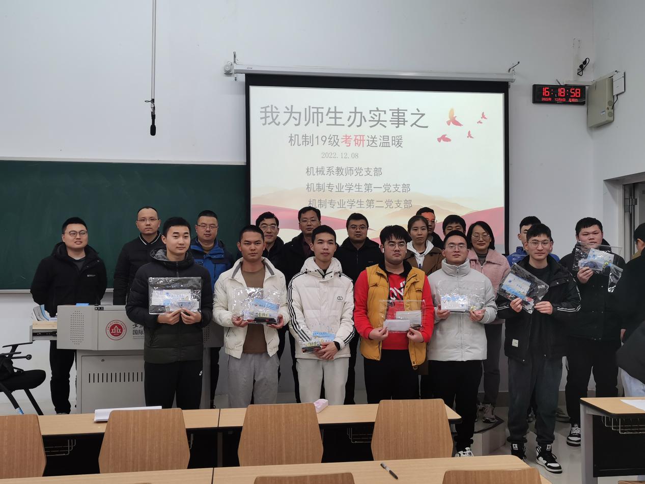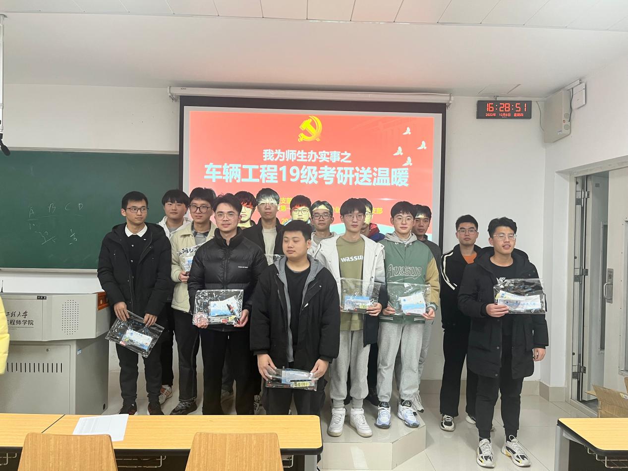 12月8日,机械工程公司党政领导、各系部老师、毕业班辅导员将提前准备好的考研大礼包送至每位学子手中。车辆工程系主任张荣芸老师叮嘱员工们保持良好的生活作息,以崭新面貌迎接考研初试,要把内心的理念和梦想做为未来人生的内在动力和前进方向,不辜负美好年华,坚持到最后一刻,为大学四年交上一份满意的答卷。