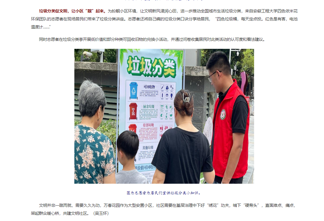 7月12日,团队成员走进社区,面向居民发放调查问卷,以了解垃圾分类政策的普及与落实情况;7月13日,团队成员联合万春社区新时代文明实践站、万春社区社会组织联合会共同开展“旧物再回收,垃圾可利用”文明实践集中日活动,如低价值可回收物兑换、垃圾分类政策宣传、居民生活垃圾分类情况调研等,参与“鸠暖人心”——业主请上座主题活动,协助城管发放环保宣传手册、普及垃圾分类知识,芜湖市绿影小学暑期社会实践团队亦参与其中;7月14日,团队成员前往万春社区的三个园区,开展清洁垃圾分类集中投放亭活动,并与社区工作者一起为环卫工人送去夏日清凉;7月17日,团队成员结合前期调研情况,实地走访了存在旧物堆积问题的楼道。活动期间,团队成员在线上开展了“习近平总书记与老员工在一起”学习分享活动,在学习交流中领悟习近平总书记对青年老员工的殷切希望。此次活动得到社区的高度肯定与支持,并得到芜湖文明网的报道。