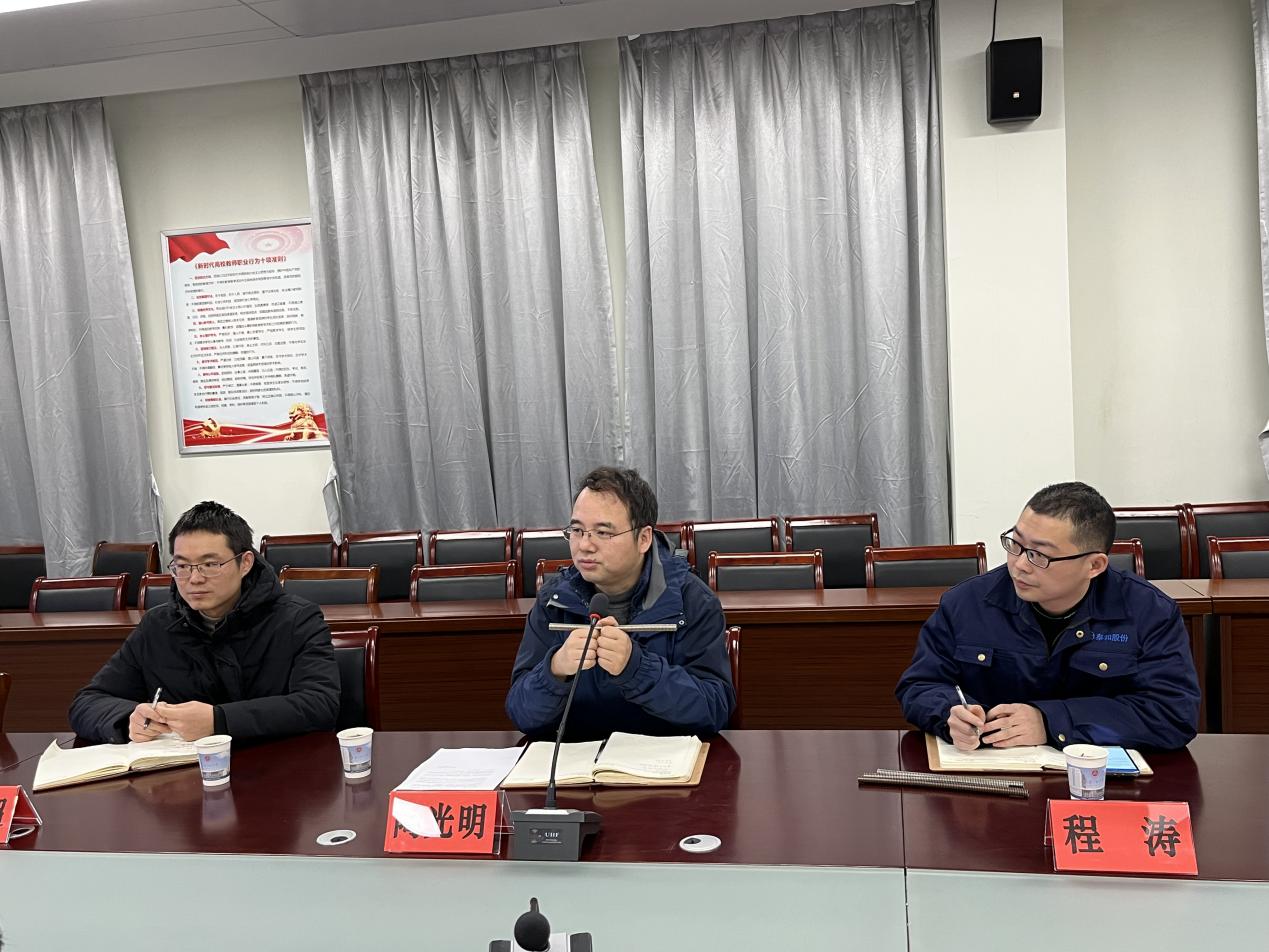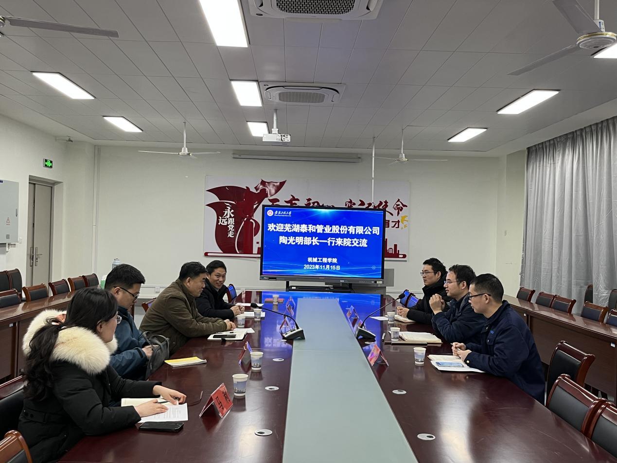 王建平对陶光明副总经理一行表示欢迎,并结合公司党建“标杆院系”经验做法,针对产教融合及技术攻关等方面的问题逐一回应。他指出,公司与芜湖泰和管业股份有限公司在党建和产教融和方面有着优渥的合作基础和良好的合作前景,结合公司学科、团队建设及人才培养模式,展望了围绕企业关键技术领域探索产教融合合作共赢模式的愿景,希望以“党建+”新模式为纽带,不断推进与泰和股份的深层次高效产教融合。王建彬简要介绍了“双带头人”教师党支部书记工作室运行的体制机制,党建工作能力,教学科研水平及取得的工作成效等情况,同时表达了与泰和股份就基层党支部“一融双高”党建共建互促的合作愿望。