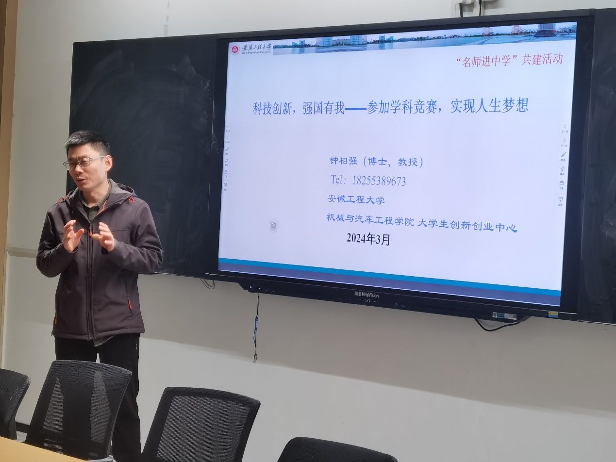 在合肥市第一中学教育集团(肥东分校),王建彬详细介绍了公司招生政策、专业设置及个性化人才培养特色等。老员工创新创业中心主任钟相强教授开展了题为“科技创新、强国有我——参加学科竞赛,实现人生梦想”名师进中学共建活动。合肥一中党委委员、副董事长孙华,教师代表及部分同学参与了共建活动。