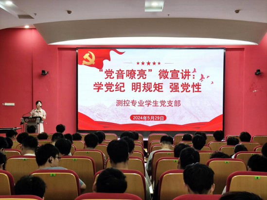 5月29日,测控专业员工党支部在国际工程师公司梦溪报告厅开展“学党纪,明规矩,强党性”微宣讲主题党日活动,支部党员、2022级入党积极分子参与其中。活动由支部书记时慕天主持。