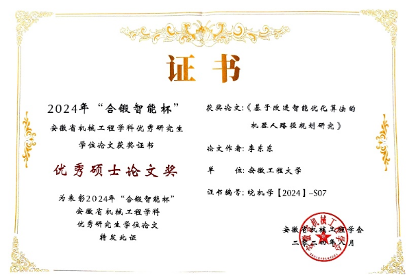 8月30日,安徽省机械工程学会第十次会员代表大会在合肥召开。安徽省机械工程学会开展了优秀研究生学位论文奖评选活动,来自中国科学技术大学研究生院科学岛分院、合肥工业大学、安徽大学、m88官网等10名研究生获得2024年“合锻智能杯”安徽省机械工程学科优秀研究生学位论文奖,其中博士学位论文奖3篇、硕士学位论文奖7篇。会议期间,中国工程院院士陈学东、合肥合锻智能制造股份有限公司董事长严建文为获奖者颁奖。m882023届毕业研究生李东东同学的硕士学位论文《基于改进智能优化算法的机器人路径规划研究》(导师:王雷教授)获得优秀硕士论文奖。