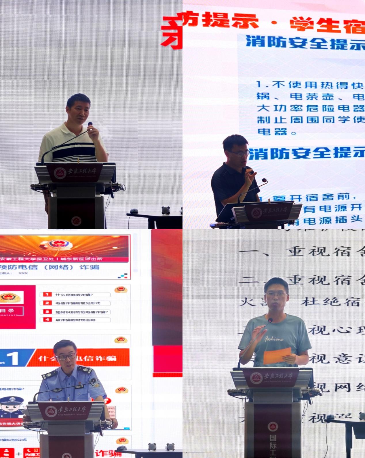 为做好新学期校园安全工作,9月4日,m88在国际工程师公司校区开展新学期校园安全教育活动,公司党委副书记秦广虎、全体辅导员及员工党员、员工干部、寝室长代表300余人参会。活动邀请了校保卫处赵荣俊、吴珊珊和国际工程师公司校区管理委员会苏醒、徐伟四位老师。