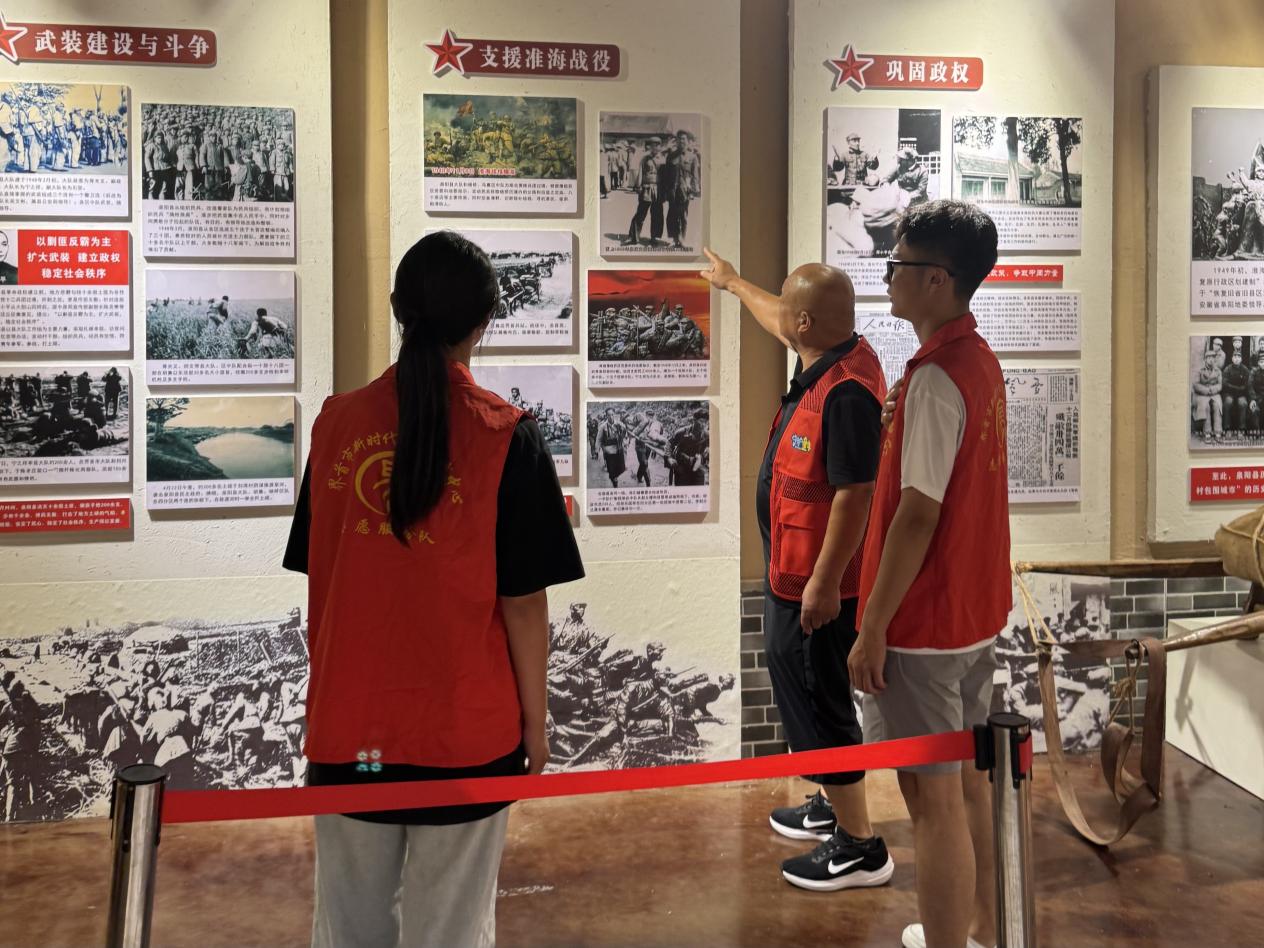 走进民俗馆,历史的气息扑面而来,志愿红与历史相遇。跟着讲解员的讲解,探寻“支援淮海战役”“巩固政权”的往昔,让红色记忆与农耕文化,在交流中鲜活起来。老员工志愿服务队成员们凝视“武装建设”“支援战役”的历史展板,先辈们的奋斗故事,在眼神交汇与倾听中,照进当下。我们身着志愿红,于历史图文间穿梭,感悟先辈热血,让红色传承在聆听中延续。