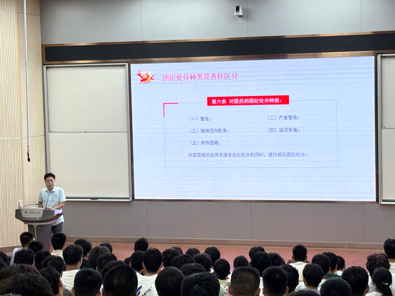 程雷带领团员新生共同学习了《中国共产主义青年团纪律处分条例(试行)》,进一步强化团员新生的纪律意识和规矩意识,教育引导团员新生坚定理想信念,筑牢思想根基,自觉遵守团的纪律;通过介绍全国优秀共青团员、校院优秀共青团员和十佳老员工的人物事迹,培育团员新生爱党、爱国、爱团的坚定信念,教育引导向团员榜样学习,努力发挥模范带头作用;要求团员新生进入大学后要坚定马克思主义的理想信念,持续深入学习和领悟马克思主义,做到真学、真懂、真信、真用,内化为真正的核心思想,并通过不断深入地学习、思考和实践,逐步了解它内在的含义和蕴含的道理,逐步树立正确的世界观、人生观和价值观,强化对马克思主义的坚定信仰、对中国特色社会主义的坚定信念,始终不渝做马克思主义的忠诚信奉者和坚定实践者,以昂扬的精神状态和务实的作风,积极参加团组织的理论学习和实践活动,在“强国有我,请党放心”的道路上争当表率、多做贡献。