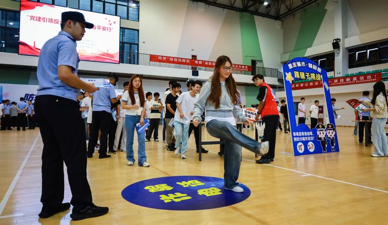 此次活动共分为“起跑线·识诈明眼”健康跑400米、“圈套陷阱·我不钻”套圈挑战、“精准投掷·破骗局”投壶挑战和“踢走骗术·稳脚跟”踢毽子挑战4个趣味挑战环节,将反诈知识与健康运动、趣味游戏通过情景互动深度融合。同学们在欢声笑语中踊跃参与,收获了精美的纪念品和实用的反诈知识。据悉本次活动共吸引200余名同学参加。